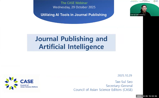 The first presentation was given by Dr. Tae-Sul Seo, Secretary-General of CASE, under the theme “Journal Publishing and AI.” He first raised issues in AI use in journal publishing, as identified in some studies. In his presentation, he also provided an overview of using AI Tools in journal publishing and concluded by emphasizing the need for journal policies on AI.